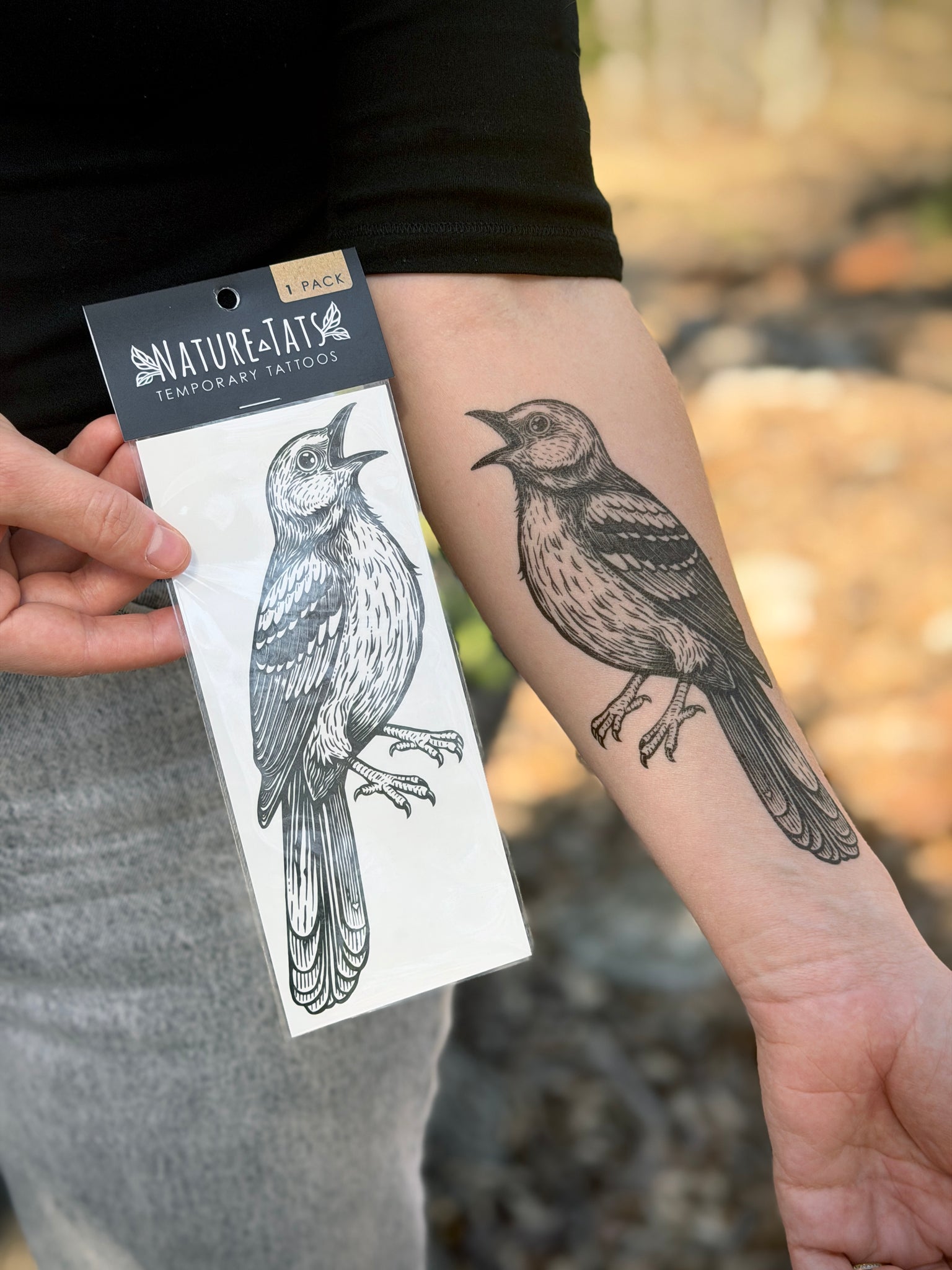 This mockingbird temporary tattoo is illustrated in black linework, applied with water, and wears for 2–5 days. It is designed for people drawn to birds and the steady presence of nature.
