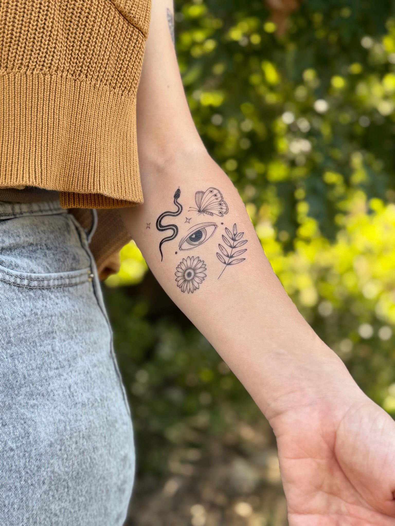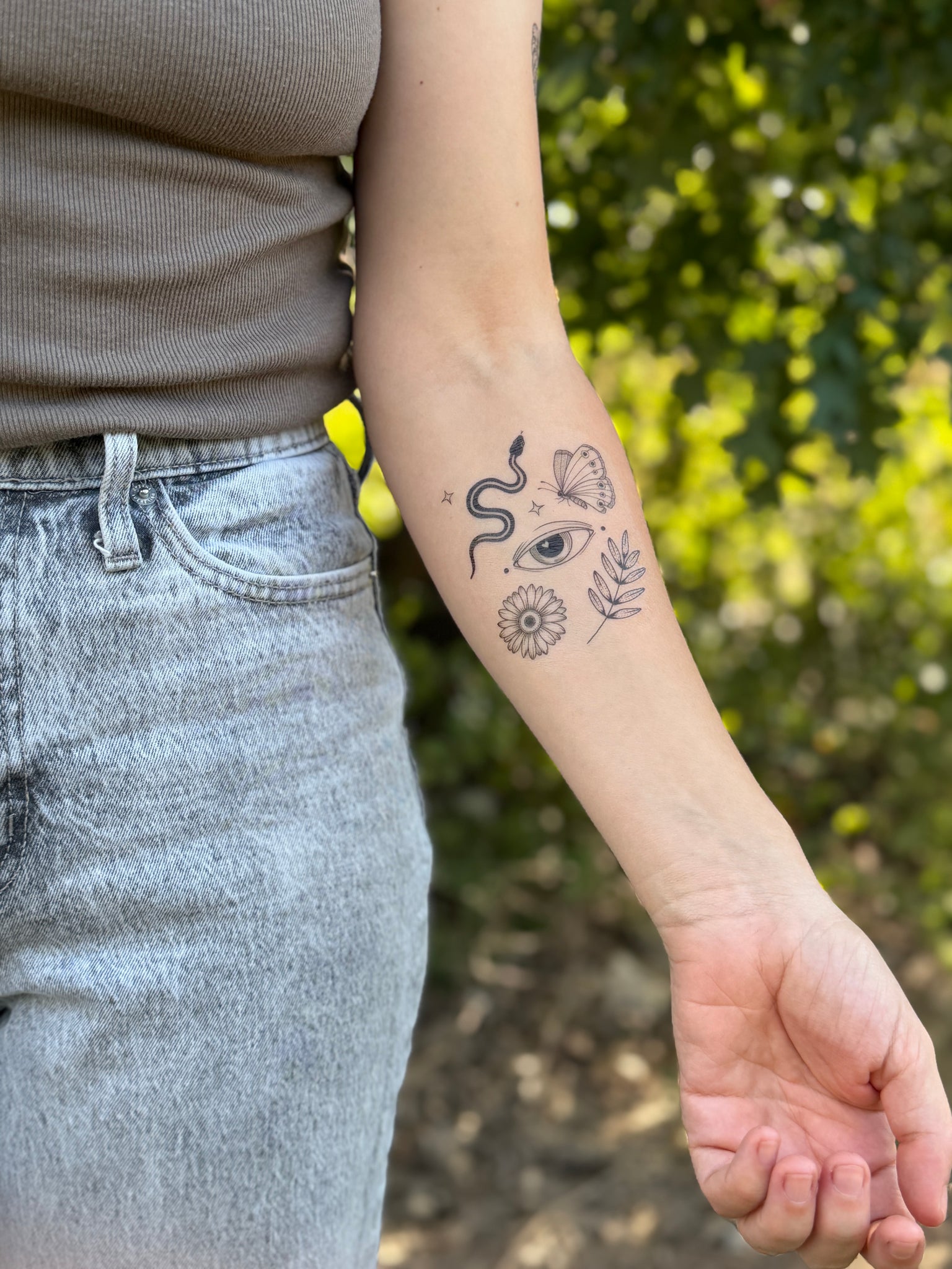 Earthly visions temporary tattoo sheet, black ink designs with pops of white ink! This small tat collection includes a sweet butterfly angled to the side showing off her spotted wings, a baby garden snake black with a single white stripe, a centered eye with a gentle gaze, a multi-leaf twig, a fresh daisy bloom, and two little sparkles.