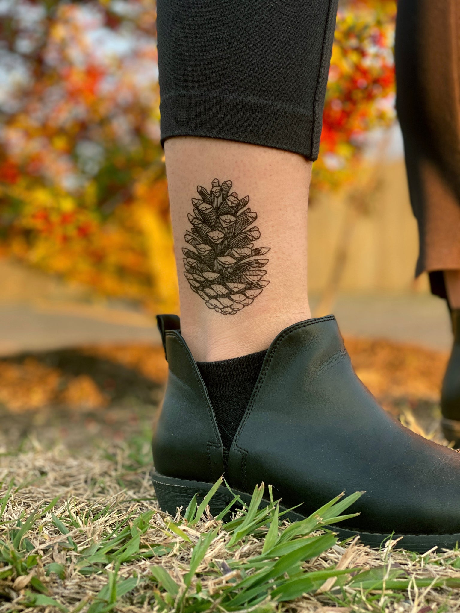 Pinecone temporary tattoo, original design, hand-drawn in black lines. This familiar woody seed pod will become a towering pine tree over half of a century. The pinecone is the beginning, and represents awareness and presence.