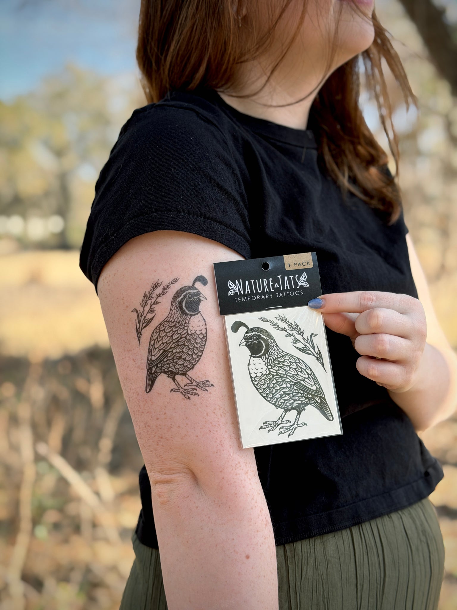 This quail temporary tattoo is illustrated in black linework, applied with water, and wears for 2–5 days. It is designed for people drawn to attentiveness, grounded movement, and life lived close to the land.